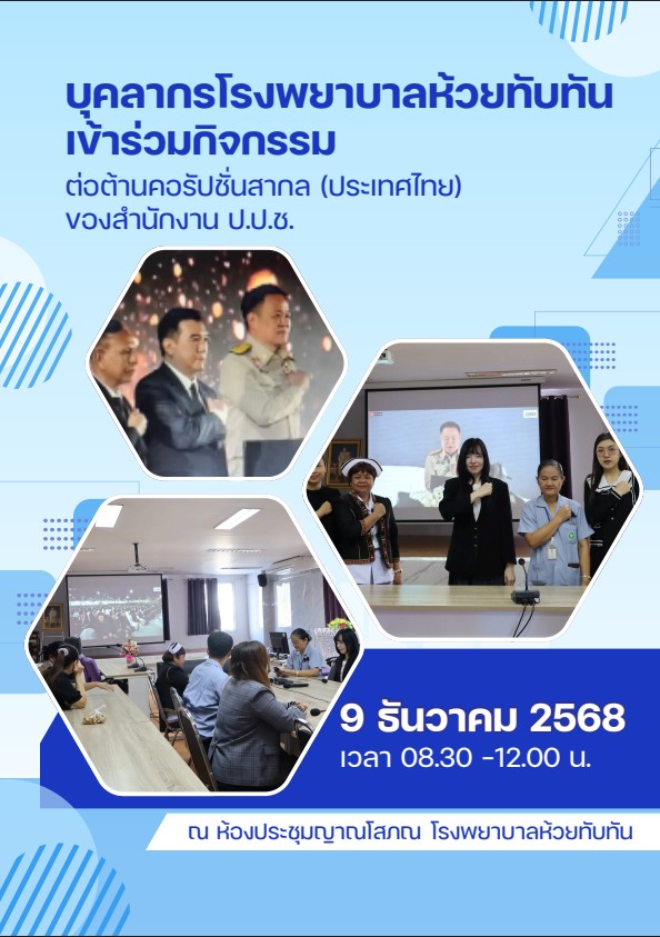 บุคคลกรโรงพยาบาลห้วยทับทัน เข้าร่วมกิจกรรม ต่อต้านคอรัปชั่นสากล (ประเทศไทย) ของสำนักงาน ป.ป.ช. ในวันที่ 9 ธันวาคม 2568 เวลา 08:30 – 12:00 น.
