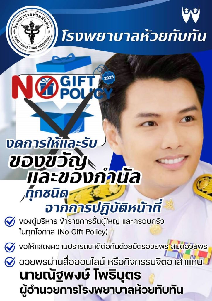 โรงพยาบาลห้วยทับทัน มีนโยบาย งดการให้และรับของขวัญและของกำนัลทุกชนิด จากการปฏิบัติหน้าที่ของผู้บริหาร ข้าราชการชั้นผู้ใหญ่ และครอบครัว ในทุกโอกาส (No Gift Policy) ข้อให้แสดงความปราถถนาดีต่อกันด้วยบัตรอวยพร สมุดอวยพร ด้วยพรผ่านสื่อสังคมออนไลน์ หรือทำกิจกรรมอาสาแทน