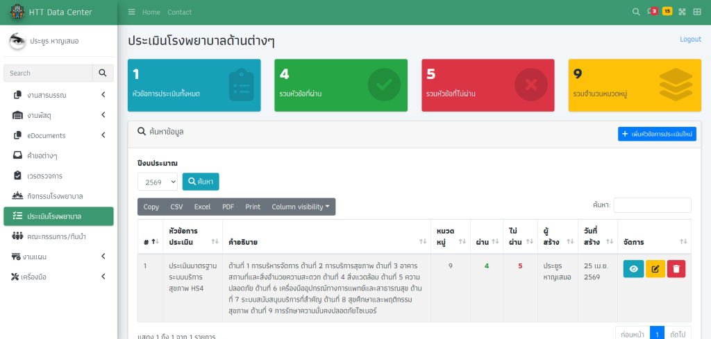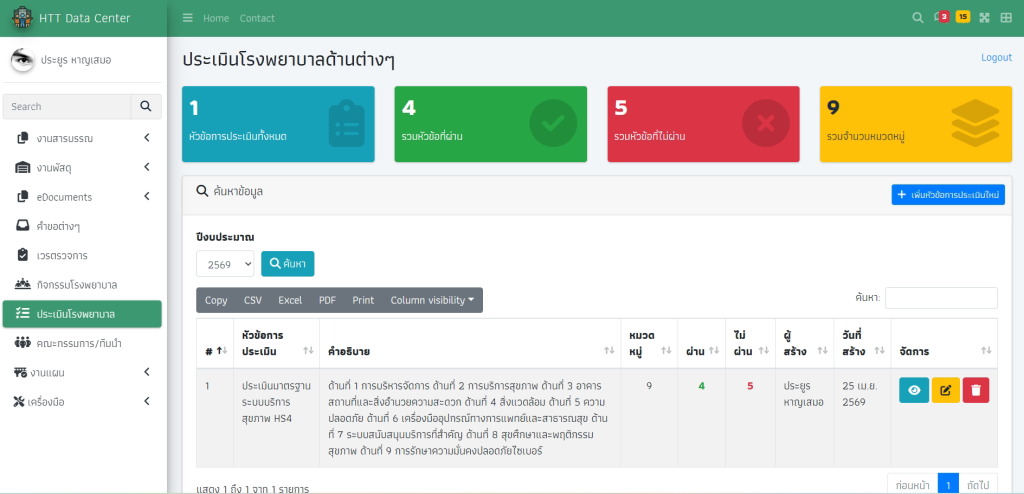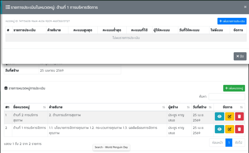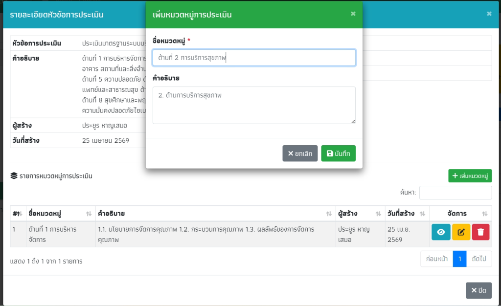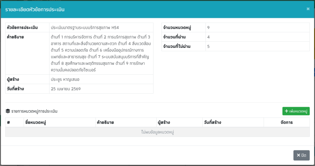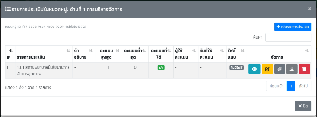 คลิกที่สัญลักดวงตาเพื่อเปิดหน้ารายการในแต่ละหมวดหมู่ จากนั้นกด “เพิ่มรายการประเมิน”