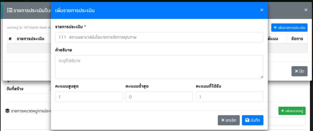 ระบุหัวข้อการประเมิน, คะแนนสูงสุด,คะแนนต่ำสุด,และคะแนนที่ได้ แล้วกด “บันทึก”